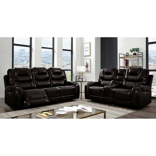 Load up on comfort in a cool, clean-lined and contemporary way with this power reclining loveseat in chocolate brown. Rest assured, the leather mat...
